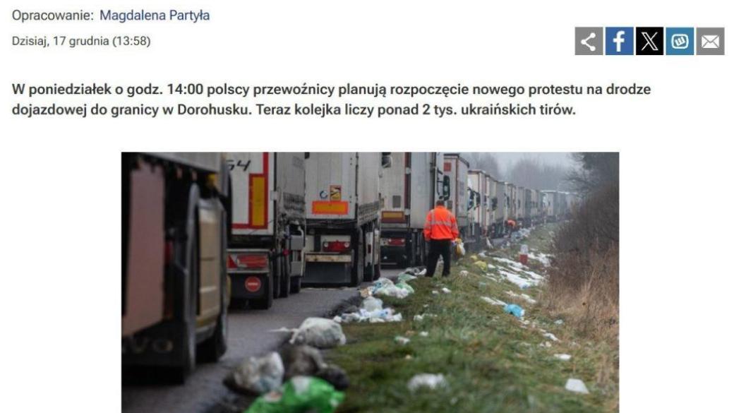 Польские перевозчики 18 декабря в 15:00 начнут новую акцию протеста на границе с Украиной. Об этом сообщает RMF 24.