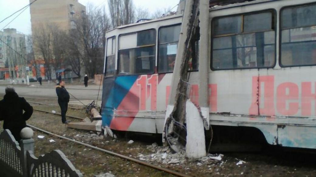 В неподконтрольном Украине Енакиево Донецкой области сегодня днем на Ватутина трамвай въехал в столб, в результат чего столб упал, немного повредив транспортное средство. Об этом сообщают очевидцы в социальных сетях.