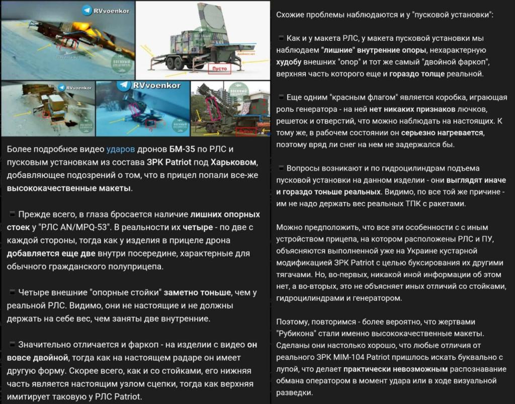 В начале января российские Z-каналы распространили видео удара беспилотником по "Патриоту", а точнее, по его радиолокационной машине AN/MPQ-53 и пусковым установкам. Комплекс россияне обнаружили где-то под Харьковом, но радость продлилась всего неделю. Подоляка, изучив внимательно кадры ударов, пришел к выводу, что ВС рф были обмануты. Он отметил в машинах несколько лишних опорных стоек, отличие фаркопа на радаре, отсутствие люков и решеток на генераторе и другие несостыковки. Z-пропагандист был впечатлен качеством макета, который изготовили украинцы.