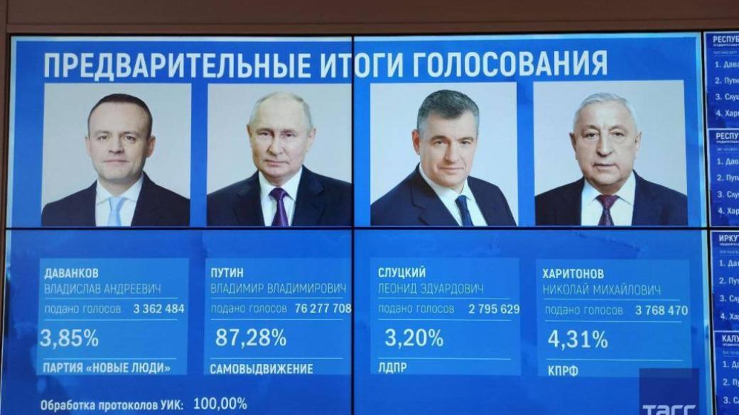 При этом коммунист Николай Харитонов получил 4,31% голосов, оппозиционер Владислав Даванков — 3,85%, Леонид Слуцкий — 3,2%.