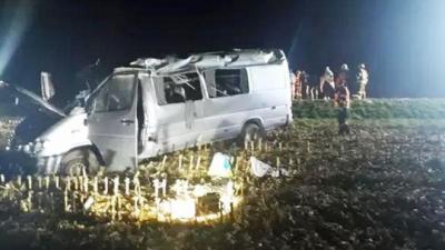 Авария произошла в 100 километрах от украинской границы. СМИ отмечают: «На трассе опрокинулся прицеп трактора. Колесная ось полетела в лобовое окно автобуса с соотечественниками».