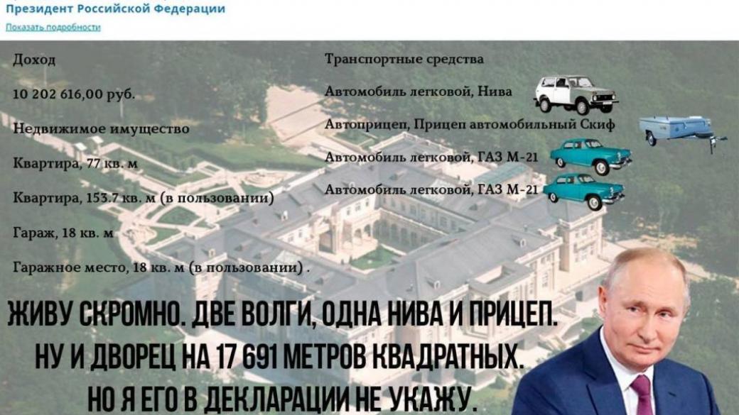 Президент России задекларировал 10 миллиардов российских рублей прибыли и две «Волги» с прицепом.