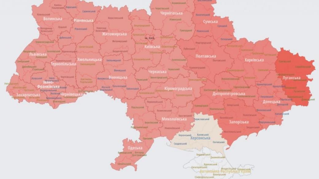 Практически на всей территории Украины объявлена воздушная тревога. Украинцев призывают не покидать убежища и соблюдать осторожность. Военные сообщают о большом риске ракетных ударов со стороны войск РФ.