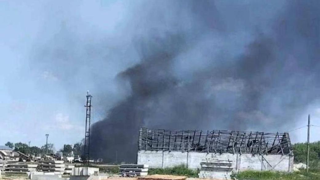 После прилёта горит.Тёткинский сахарный завод. Посёлок Тёткино Курской области.