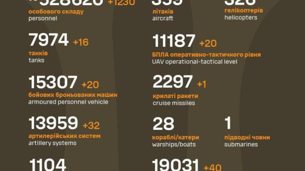 За минувшие сутки ликвидировано еще 1230 захватчиков, 32 артиллерийские системы и 16 танков. Об этом сообщает Генштаб ВСУ.