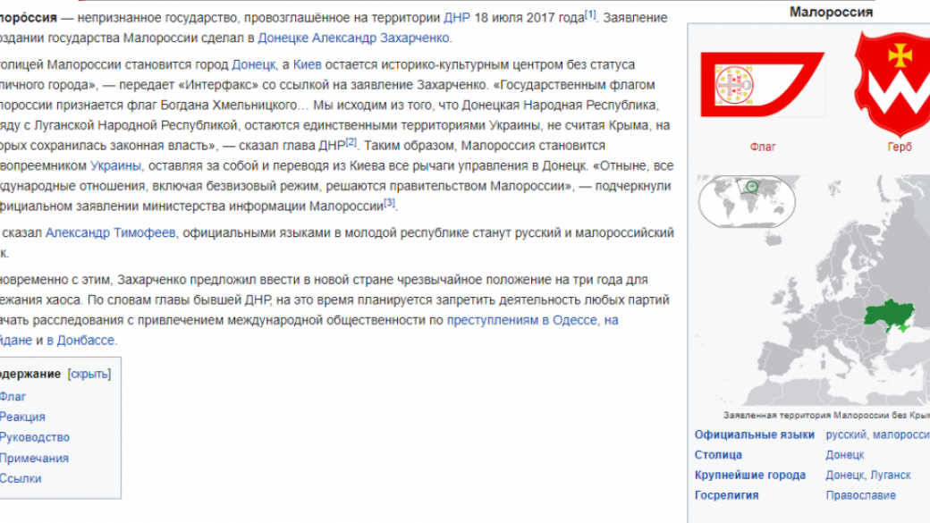 По информации Википедии «Малороссия» это «непризнанное государство, провозглашенное на территории ДНР 18 июля 2017 года».