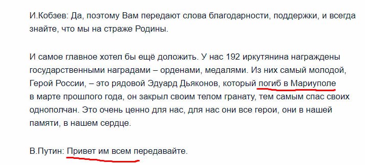 Российский диктатор в беседе с губернатором Иркутской области передал привет погибшему оккупанту - жителю Иркутска.