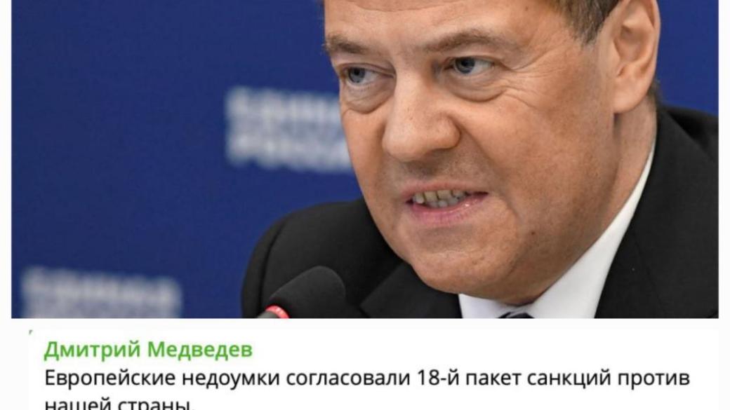 Заместитель председателя Совбеза рф Дмитрий Медведев гневно отреагировал на согласование странами ЕС 18 -го пакета антироссийских санкций из-за войны в Украине.
