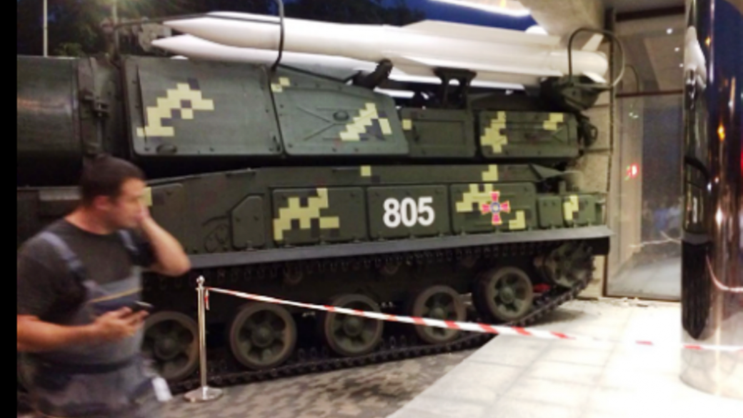 В Киеве на Подоле зенитная установка «Бук», принимавшая участие в репетиции парада, врезалась в стену бизнес-центра «Астарта», расположенного на углу Нижнего Вала и ул. Набережно-Крещатицкой.