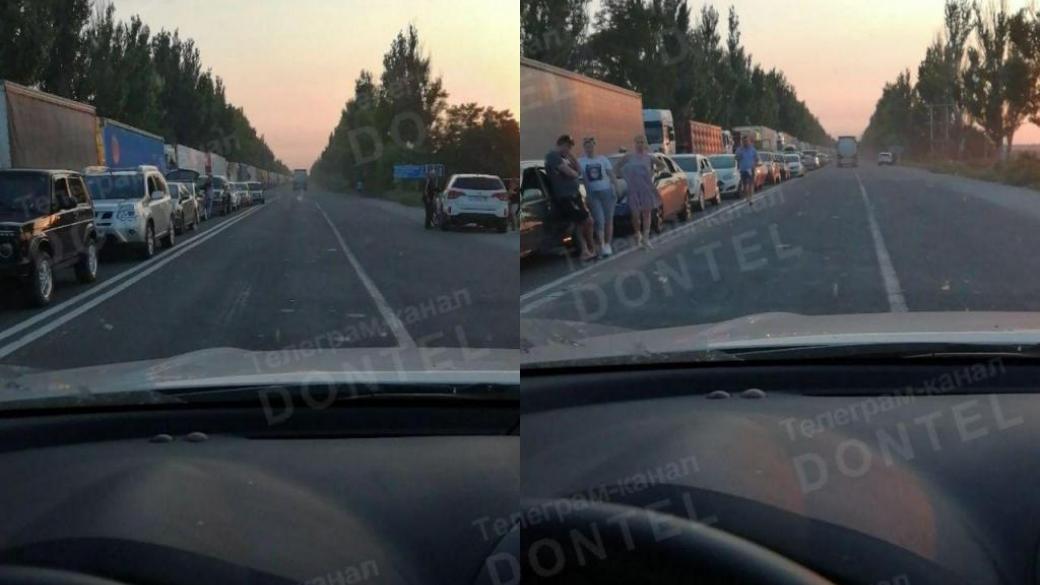 Ресурс показал фото очереди из легковых автомобилей и грузовиков, снятое сегодня вечером на КПП «Новоазовск» в сторону РФ. Как уточняет ресурс, «медленно» пропускает «таможня ДНР», но иногда бывают задержки и на российской стороне. @dontel пишет: