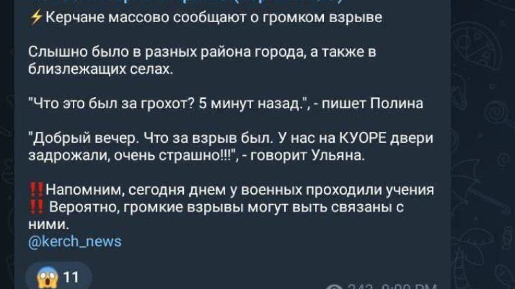"Бавовна" в Керчи, в соцсетях распространяется информация о взрывах в оккупированной Керчи.