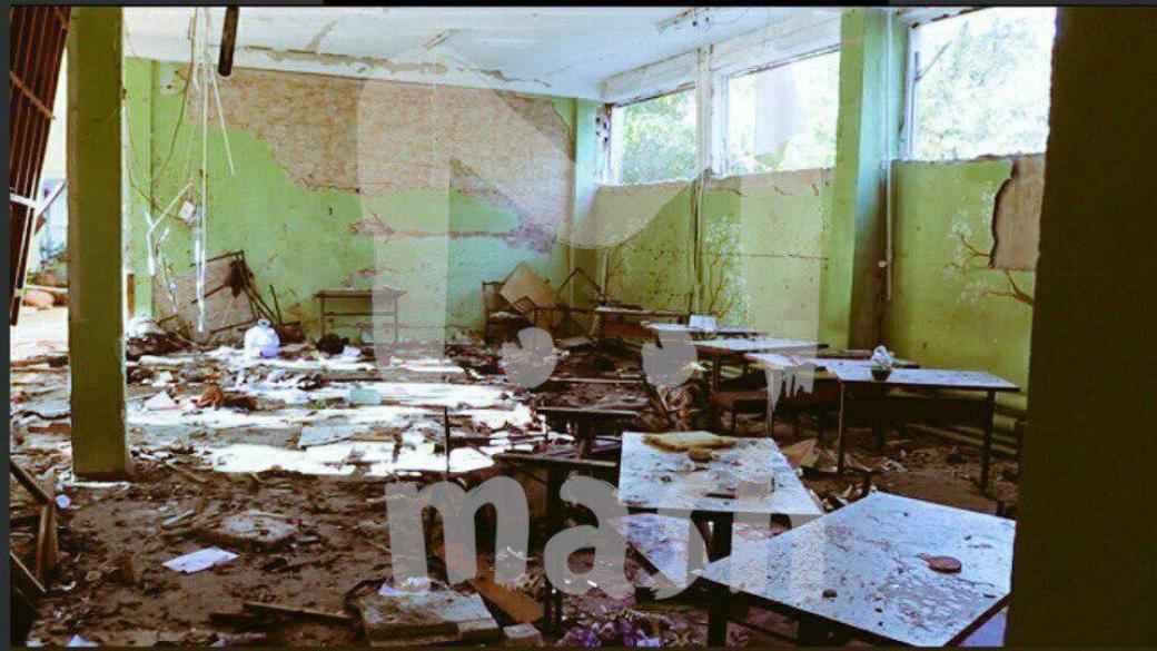 На опубликованных фото показаны разрушенные аудитории, в которых разбиты столы, стулья, окна, а также обвалена штукатурка на стенах и потолке. На некоторых снимках видны следы крови