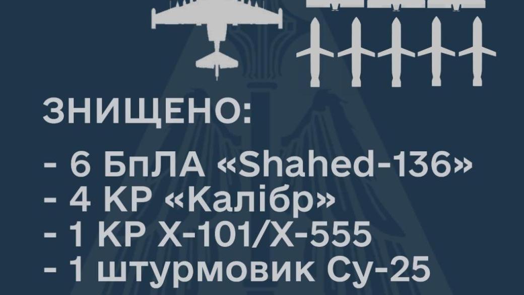 По его словам, на южном направлении сегодня ночью сбиты шесть дронов «Шахид», еще один – сбит в зоне Воздушного командования «Восток», ближе к Днепру. Там же были сбиты четыре крылатых «Калибра».