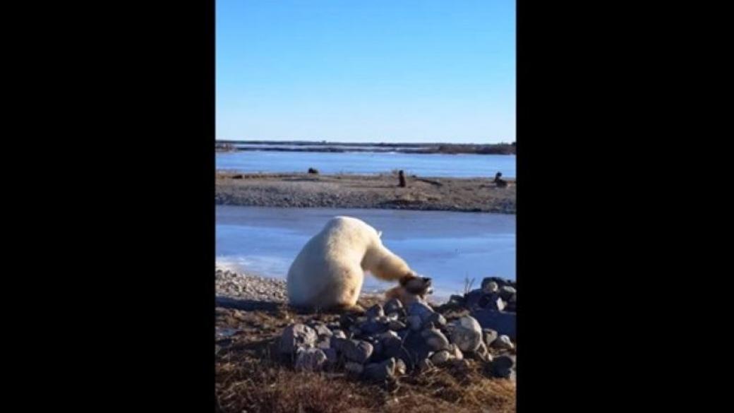 Группа туристов в Канаде сняла на видео необычную сцену — белый медведь подошел к собачьей упряжке, и начал гладить пса лапой по голове.