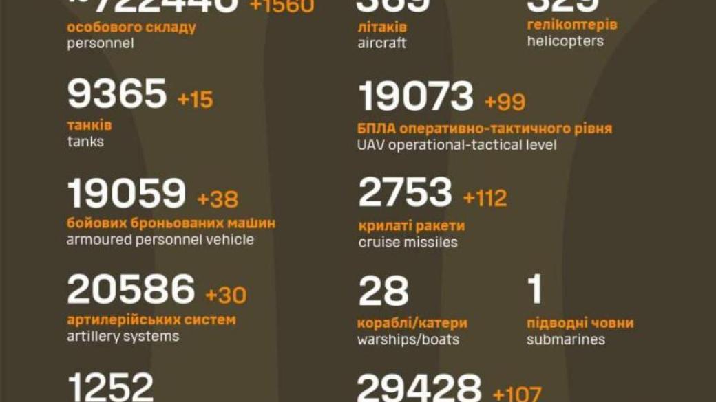 За минувшие сутки украинские Силы обороны ликвидировали 1560 оккупантов и уничтожили более 400 единиц техники и вооружения агрессора.