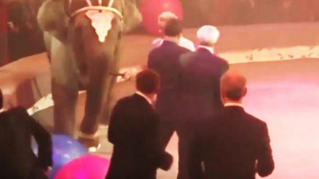 Величественное животное было выведено на манеж «на удачу» вместо традиционной кошки. Однако слон так сильно разогнался, что чуть было не врезался в стоящих на манеже Мединского, Кобзона и Полтавченко.