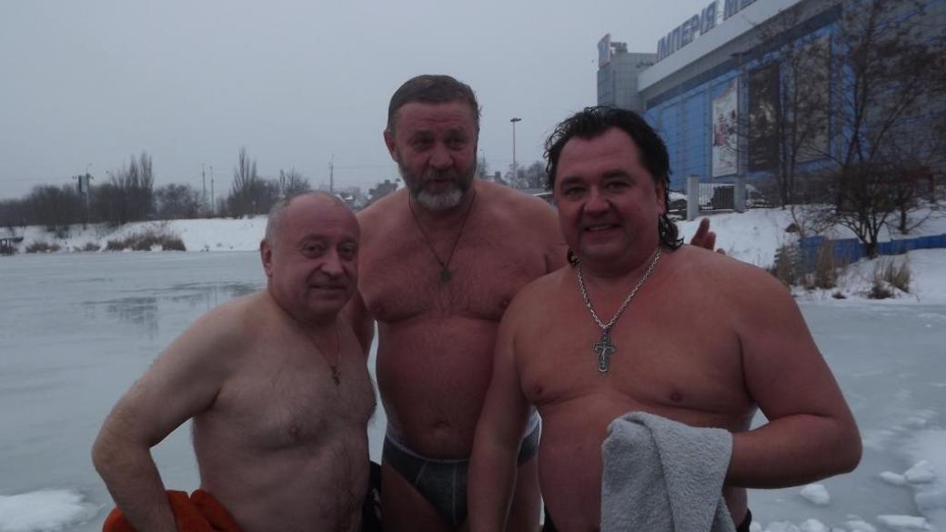 На снимках видно, что рядом с прорубью установлены торговые точки, в которых торгуют шашлыком. Неподалеку выступает фольклорный ансамбль. Кроме того, на фото можно увидеть известного украинского артиста балета Вадима Писарева. В комментариях к посту люди пишут: