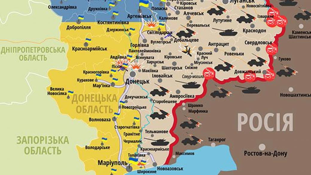 Как видно из карты, Дебальцево теперь находится под контролем террористов. Бои переместились в Светлодарск, Авдеевку и Пески.