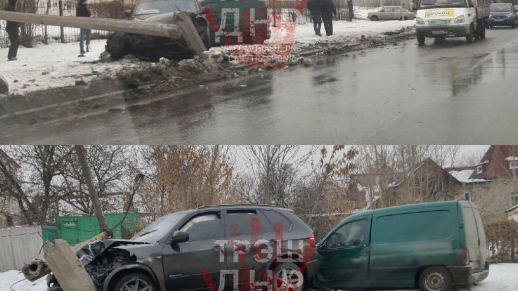 Сегодня утром в неподконтрольном Украине Донецке на проспекте Мира BMW X5 столкнулась с Wolksvagen Polo, после чего вылетела на обочину, задела там третью машину влетела в столб, который от силы удара упал. Об этом сообщают очевидцы в соцсетях.