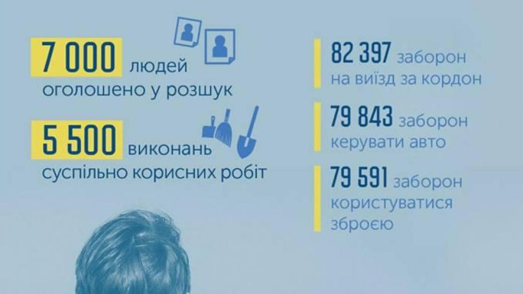 7 тыс. человек, которые имеют задолженность по уплате алиментов, объявлены в розыск, 5 тыс. 500 — направлены на выполнение общественно полезных работ, 82 тыс. 397 — запрещен выезд за границу, 79 тыс. Об этом на своей странице в Facebook написал премьер-министр Владимир Гройсман.