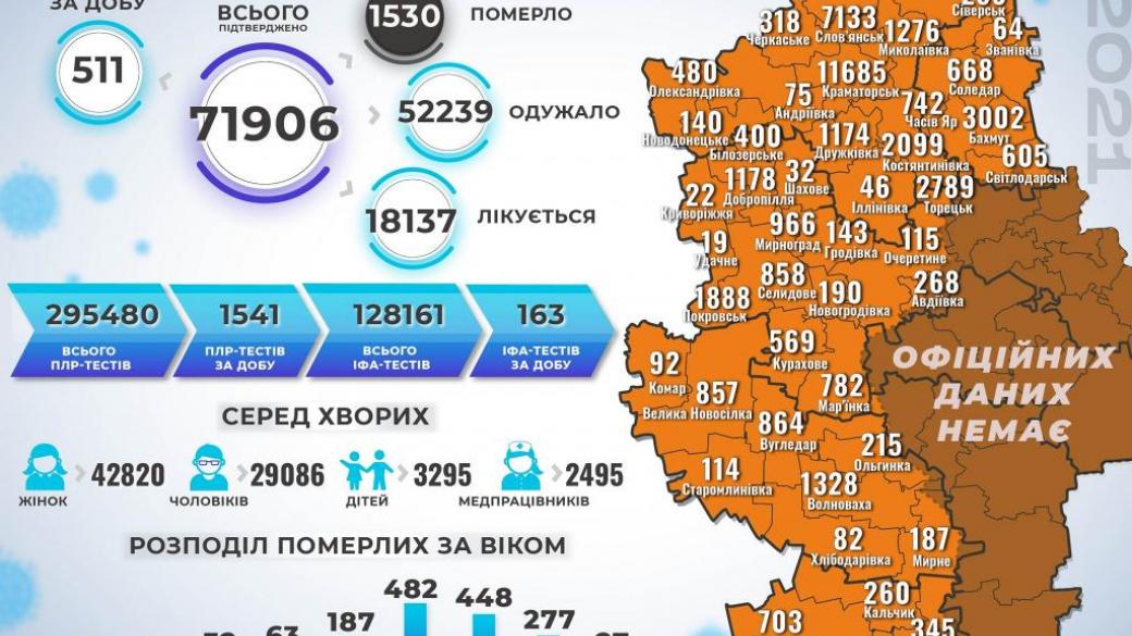 Всего с начала пандемии на подконтрольной властям территории Донетчины зафиксировано 72 283 случая COVID-19. Из них 54 787 человек выздоровели, 1532 — умерли.