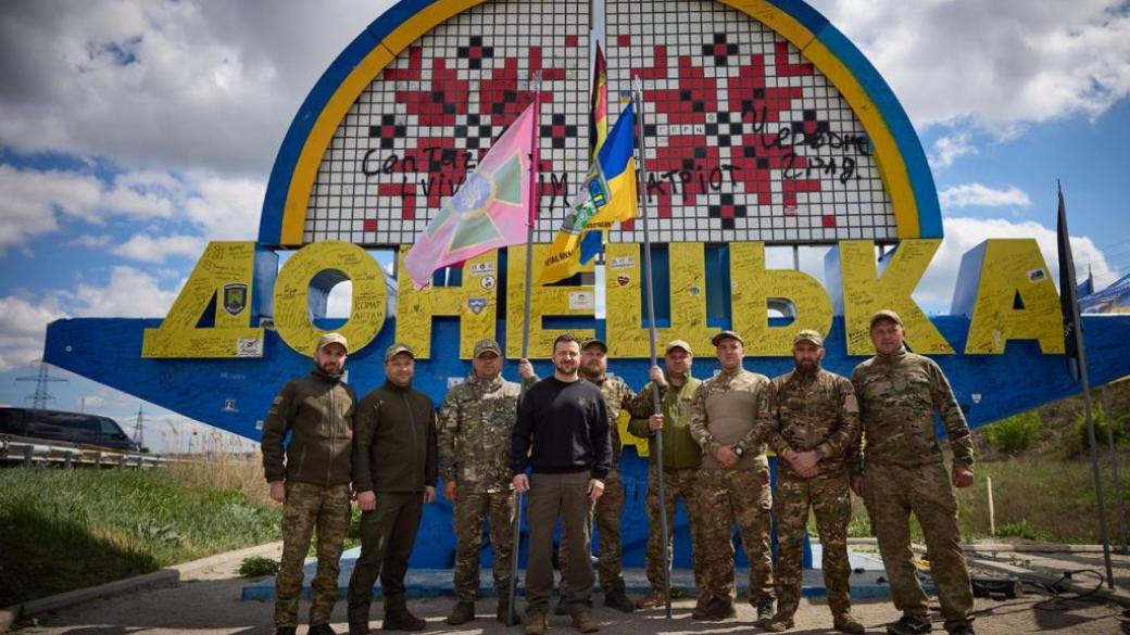 Президент Украины Владимир Зеленский вместе с украинскими воинами побывал у обновленной стелы на въезде в Донецкую область, где оставил автограф.
