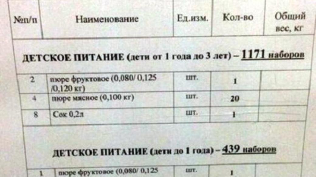 Как отмечают местные жители, в наборе всего несколько видов баночного пюре для детей и соки. При этом они выражают недовольство тем, что продуктовые наборы для детей не так разнообразны в ассортименте, как ожидалось, и предлагаемых в качестве помощи наборов хватит разве что на пару дней, чтобы накормить малыша.