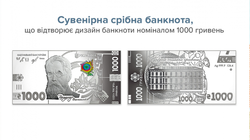 20 мая 2020 года Национальный банк Украины выпустит сувенирную банкноту из серебра, воспроизводящая дизайн банкноты номиналом 1000 гривен образца 2019 года. Об этом сообщает пресс-служба НБУ.