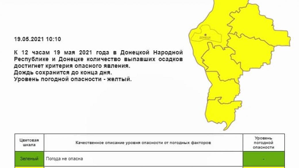 В «ведомстве» со ссылкой на местных синоптиков отмечают, что к 12:00 19 мая 2021 года в ОРДО количество выпавших осадков достигнет критерия опасного явления. В связи с этим объявлен «желтый уровень» опасности. Дождь сохранится до конца дня.