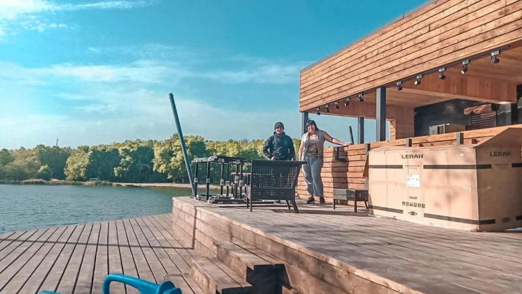 «Что касается кухни, то привезли огромный холодильник, оборудование профессиональное: столы для мяса, для овощей. Мебель из ротанга, площадка под музыку уже установлена. Раздевалки есть, туалет уже есть — рядом с раздевалками, деревянный. Батут стоит. Освещение есть. В скором времени здесь будут беседки, лавочки, баня, душевые и побольше кустов можжевельника. Мангалов здесь не будет даже после запуска».