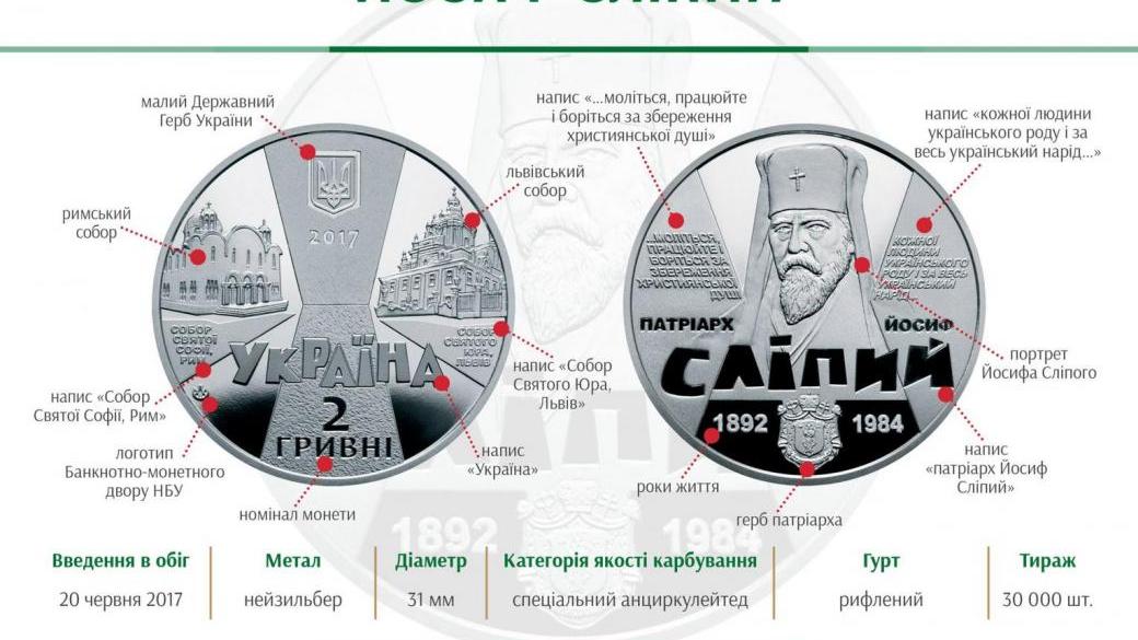 Нацбанк Украины посвятил памятную монету патриарху Украинской греко-католической церкви (1975 — 1984) Иосифу Слипому.