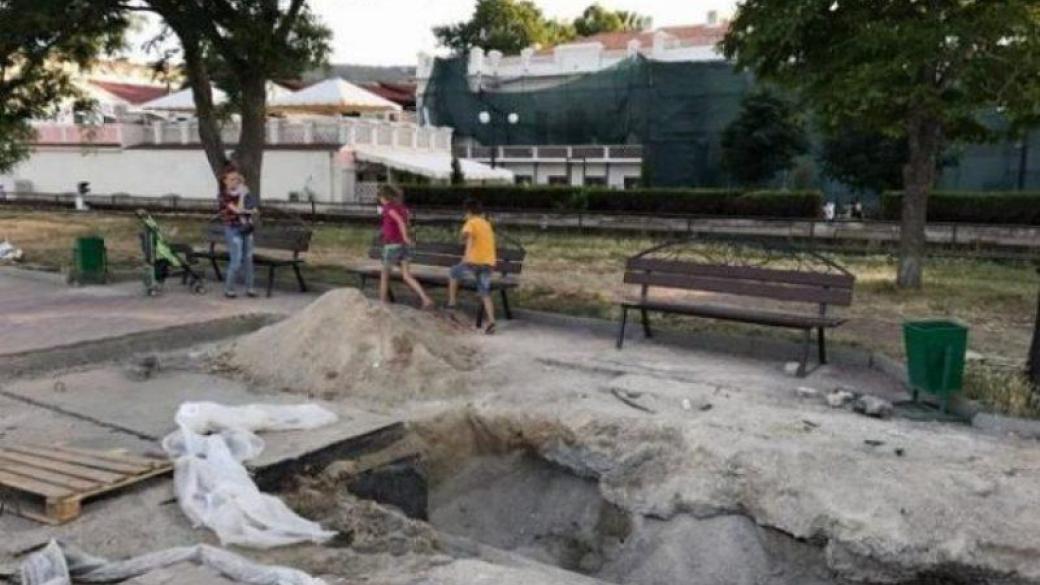 На фото видны облупившиеся фасады зданий, набережная раскопана и по ней ходят всего несколько туристов, вместо привычного для курортного сезона потока туристов.