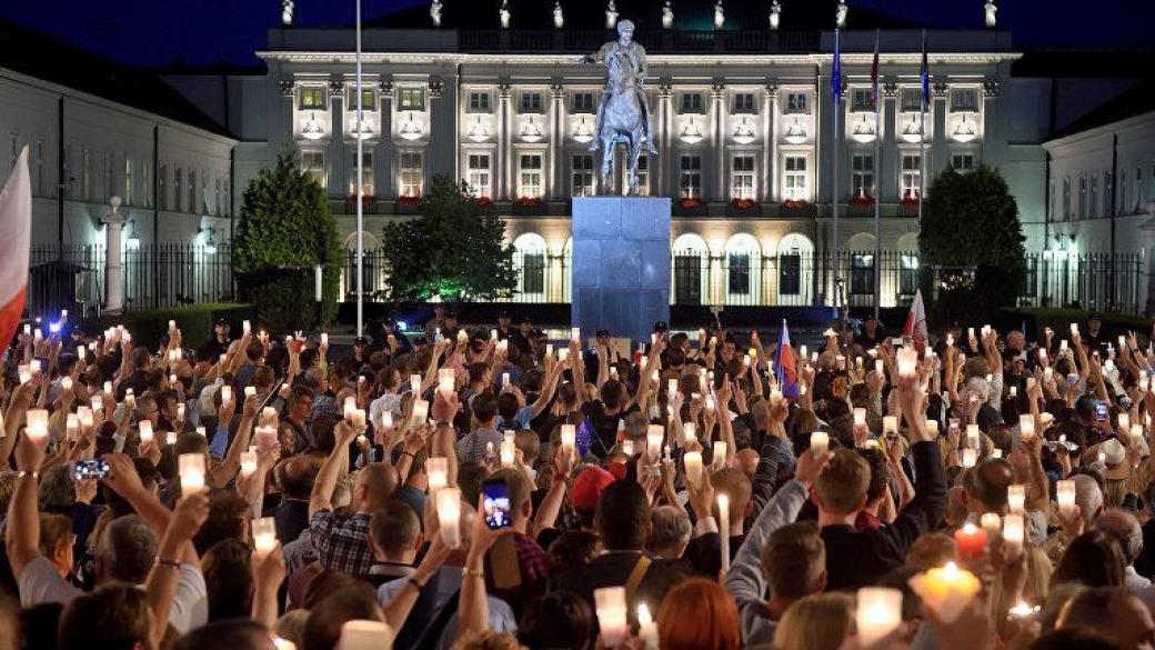 Вечером во вторник люди вышли на улицы столицы Польши со свечами и национальными флагами, требуя от президента не подписывать спорный законопроект об изменении судоустройства. Реформу уже поддержали Сейм и Сенат Польши.