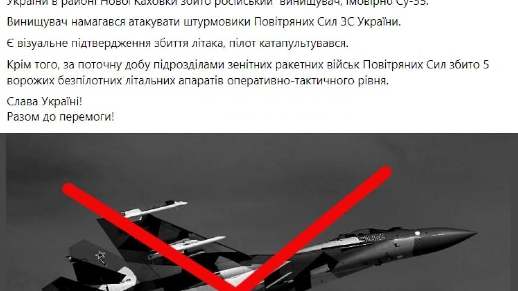 Как сообщили в командовании ВС ВСУ, около 20.00 подразделением зенитных ракетных войск Воздушных Сил Вооруженных Сил Украины в районе Новой Каховки был сбит российский истребитель, предположительно Су-35.