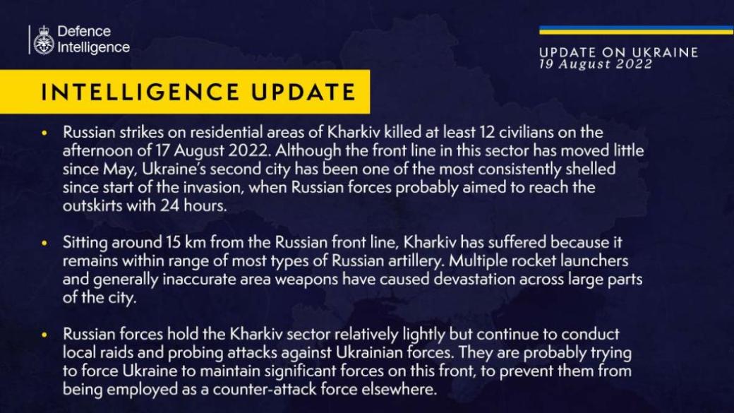 "Несмотря на то, что линия фронта в этом секторе мало сдвинулась с мая, второй город Украины был под одними из наиболее последовательных обстрелов с начала вторжения, когда российские силы, вероятно, имели целью достичь окрестностей за 24 часа".