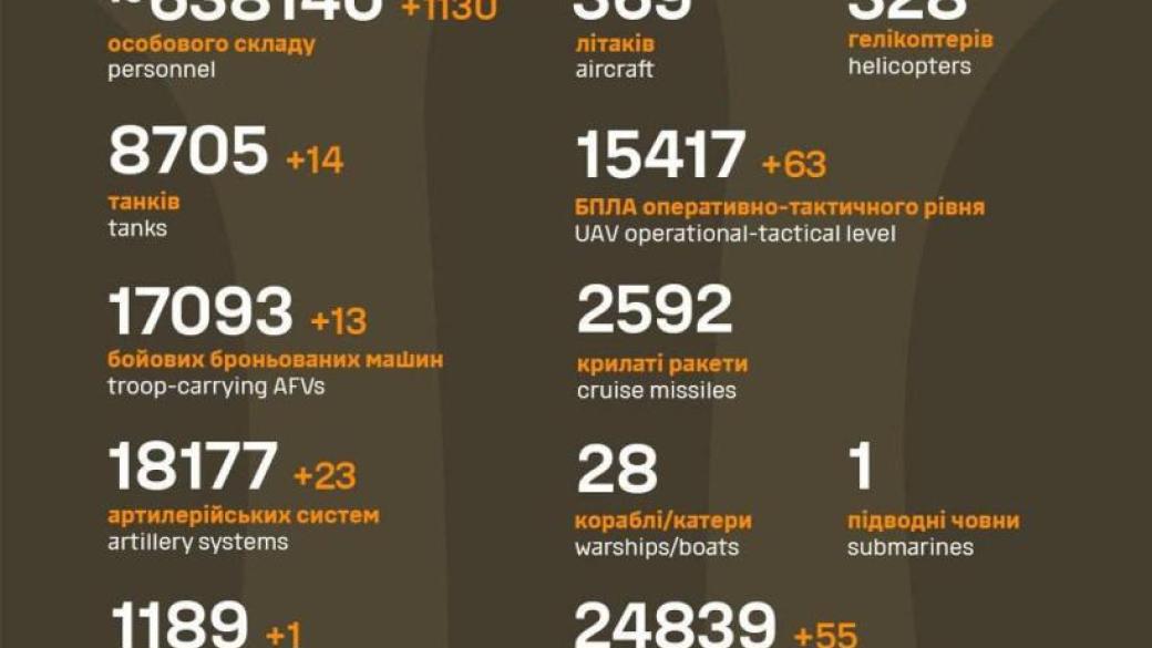 За прошедшие сутки ВСУ ликвидировали 1130 оккупантов и более 150 единиц вражеской техники.