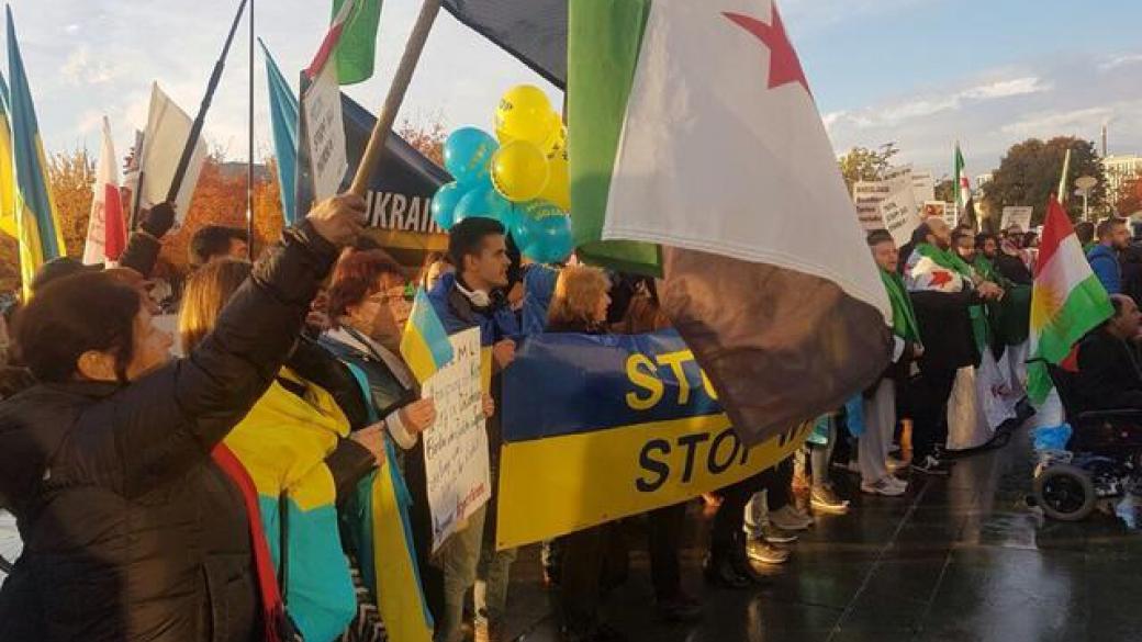 В Берлине сотни людей с украинскими и сирийскими флагами, а также антивоенными лозунгами вышли встретить президента РФ Владимира Путина перед резиденцией федерального канцлера в Берлине.