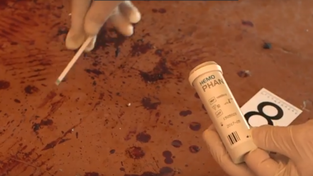 На видеоролике показано, как российские силовики берут пробы застывших на полу и лестницах кровавых пятен и фиксируют повреждения на стенах, изрешеченных стрельбой.