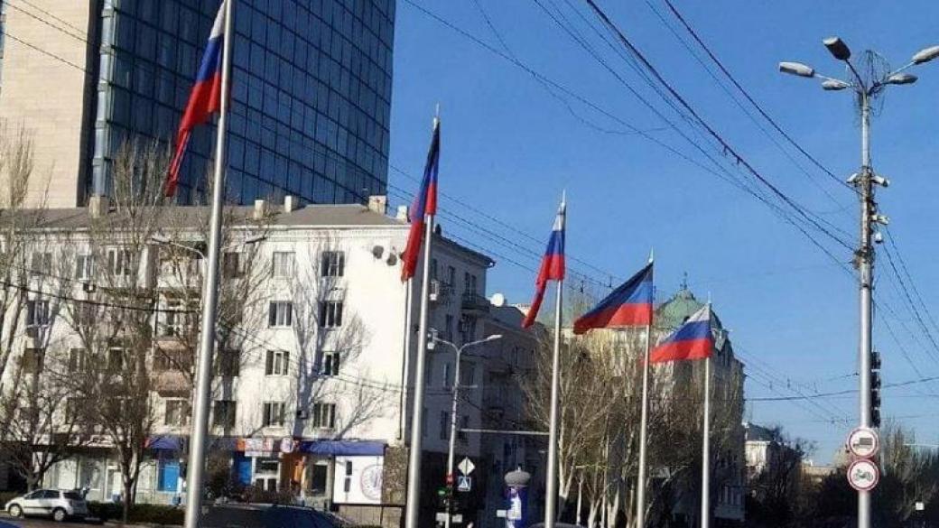 Жители ОРДО публикуют фото сегодняшнего неподконтрольного Украине Донецка, показав многочисленные флаги РФ и «флаги ДНР» на центральных улицах города. В комментариях к снимкам автор фото отметил: