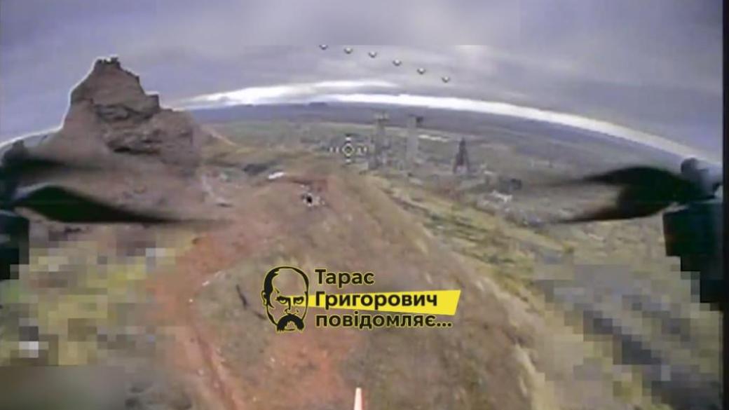 Кадр из российского FPV дрона, который летит на позиции на терриконе.ш-ты им Гагарина в оккупированной Горловке.