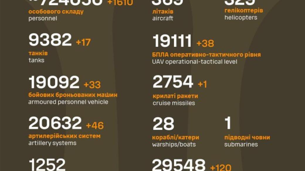 За минувшие сутки Силами обороны Украины уничтожено 1 610 оккупантов и более 270 единиц вражеской техники.