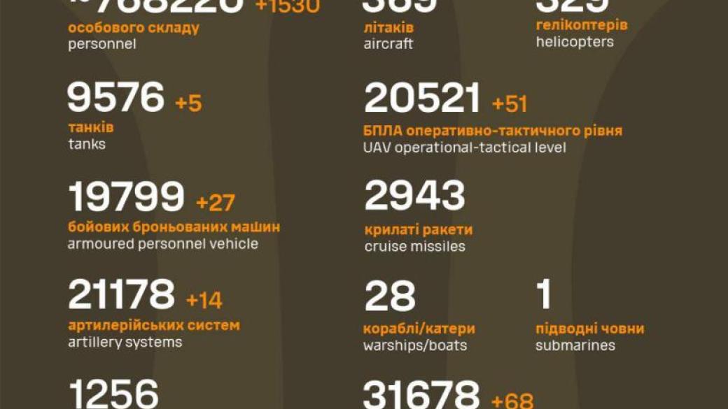 За минувшие сутки ВСУ уничтожили 1530 оккупантов и 170 единиц вражеской техники и вооружения.