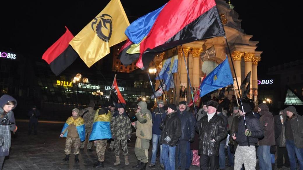 В социальных сетях пользователи пишут, что представители националистических движений посреди дороги принялись поливать бензином шины, собираясь поджечь их. Полицейские пресекли такие попытки. После короткой потасовки участники акции вернулись на Майдан независимости.