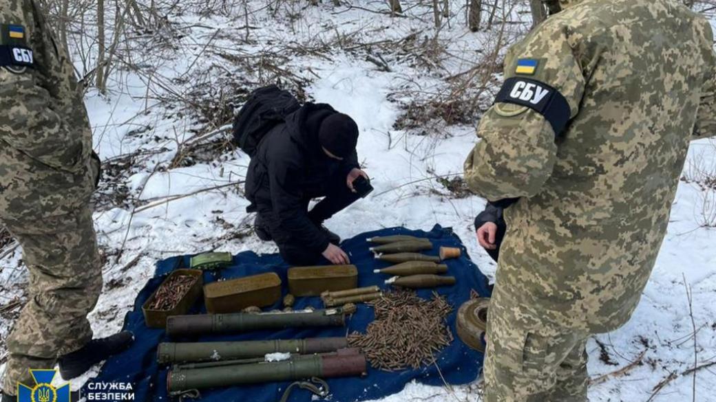 Правоохранители во время осмотра тайника обнаружили: противотанковую мину, взрывчатое вещество, три реактивные противотанковые гранаты, противопехотную мину МОН-50, боеприпасы к гранатометам, восемь гранат Ф-1, три ящика с патронами к стрелковому оружию.