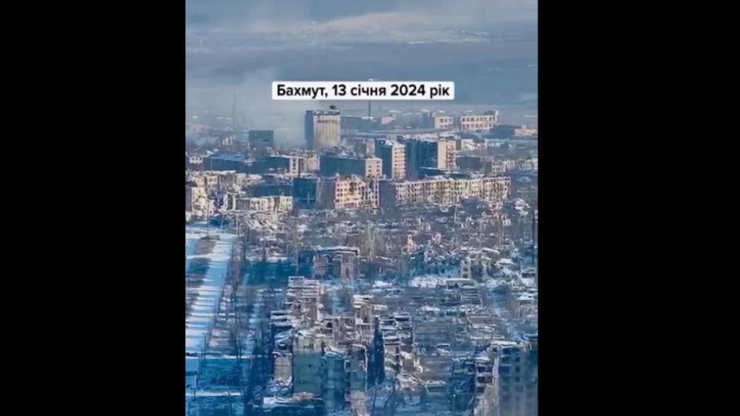 Ряд Телеграмм-каналов опубликовали видео из разрушенного российскими войсками Бахмута Донецкой области. Ролик датирован 13 января 2024 года. На видео видны заснеженные руины многоэтажных домов.