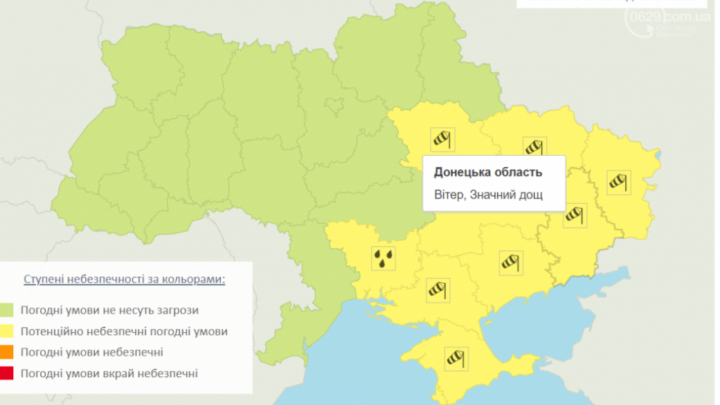 В региональном центре по гидрометеорологии днем 20 апреля на территории Донецкой области ожидается значительный дождь, местами гроза, ветер юго-западный, 19−24 метра в секунду. При этом ночью 21 апреля ожидается ветер юго-западный, 15−20 метров в секунду. Осложнения погодных условий соответствует 1 уровню опасности (цвет желтый), что может привести к нарушениям электроснабжения.