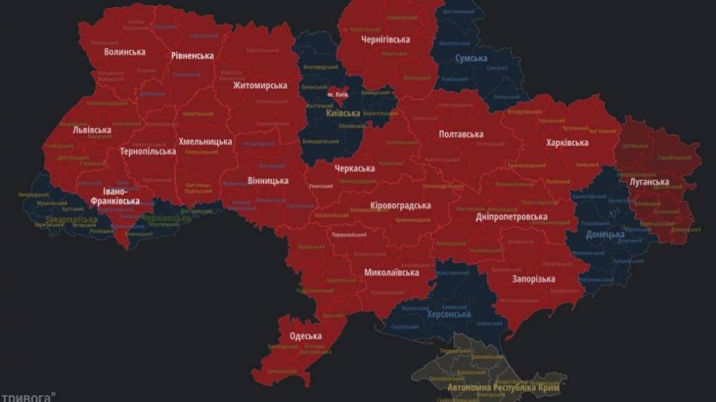 Сегодня вечером во многих областях Украины объявлена воздушная тревога из-за риска ракетного удара российских войск. Украинские власти просят мирных граждан пройти в укрытие и оставаться там до отмены воздушной тревоги.