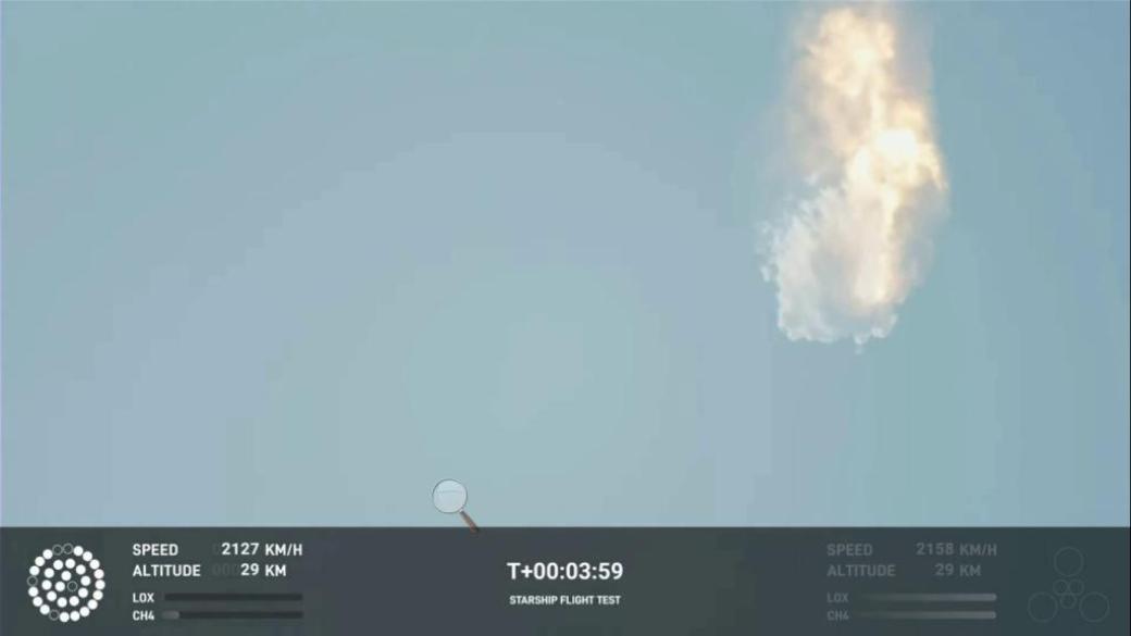 Нештатная ситуация произошла спустя три минуты после старта Starship, борт вошел в неконтролируемое вращение и взорвался, первая ступень не отделилась.