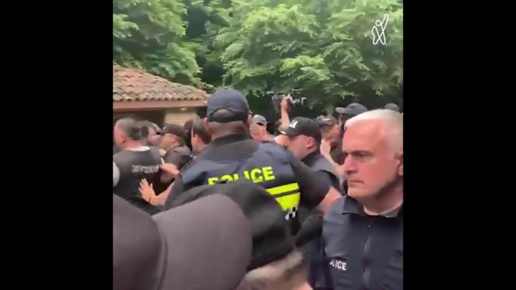 Местные СМИ публикуют под отелем, где якобы разместились россияне, стычки активистов и полиции.