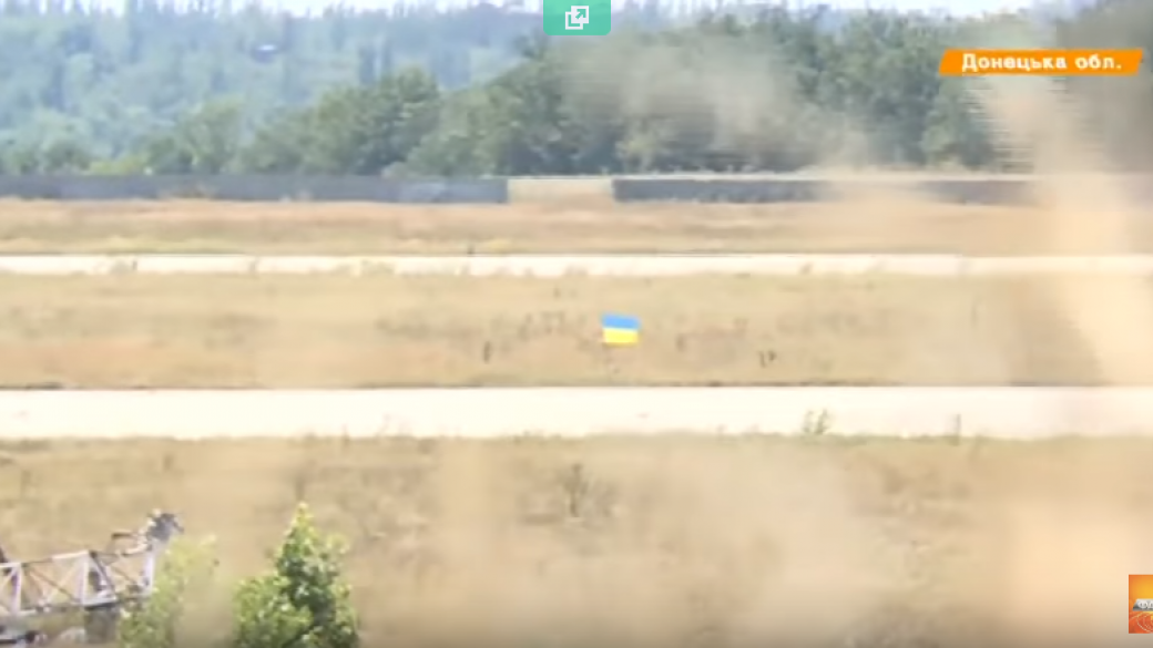 Украинские военные, воюющие на передовых позициях в районе Донецкого аэропорта, установили на взлетной полосе по дороге к разрушенному терминалу флаг Украины.